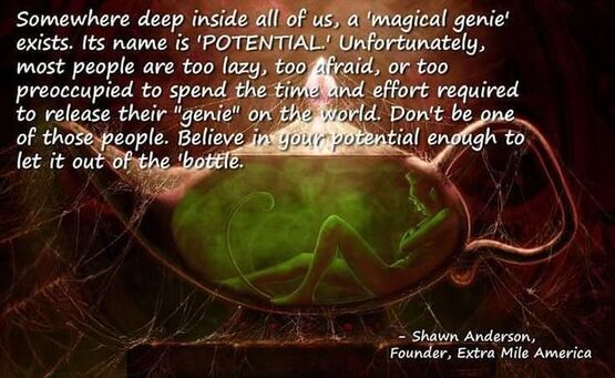Somewhere deep inside all of us, a ‘magical genie’ exists. Its name is ‘POTENTIAL’ Unfortunately, most people are too lazy, too afraid, or too preoccupied to spend the time and effort required to release their “genie” on the world. Don’t be one of those people. Believe in your potential enough to let it out of the bottle.